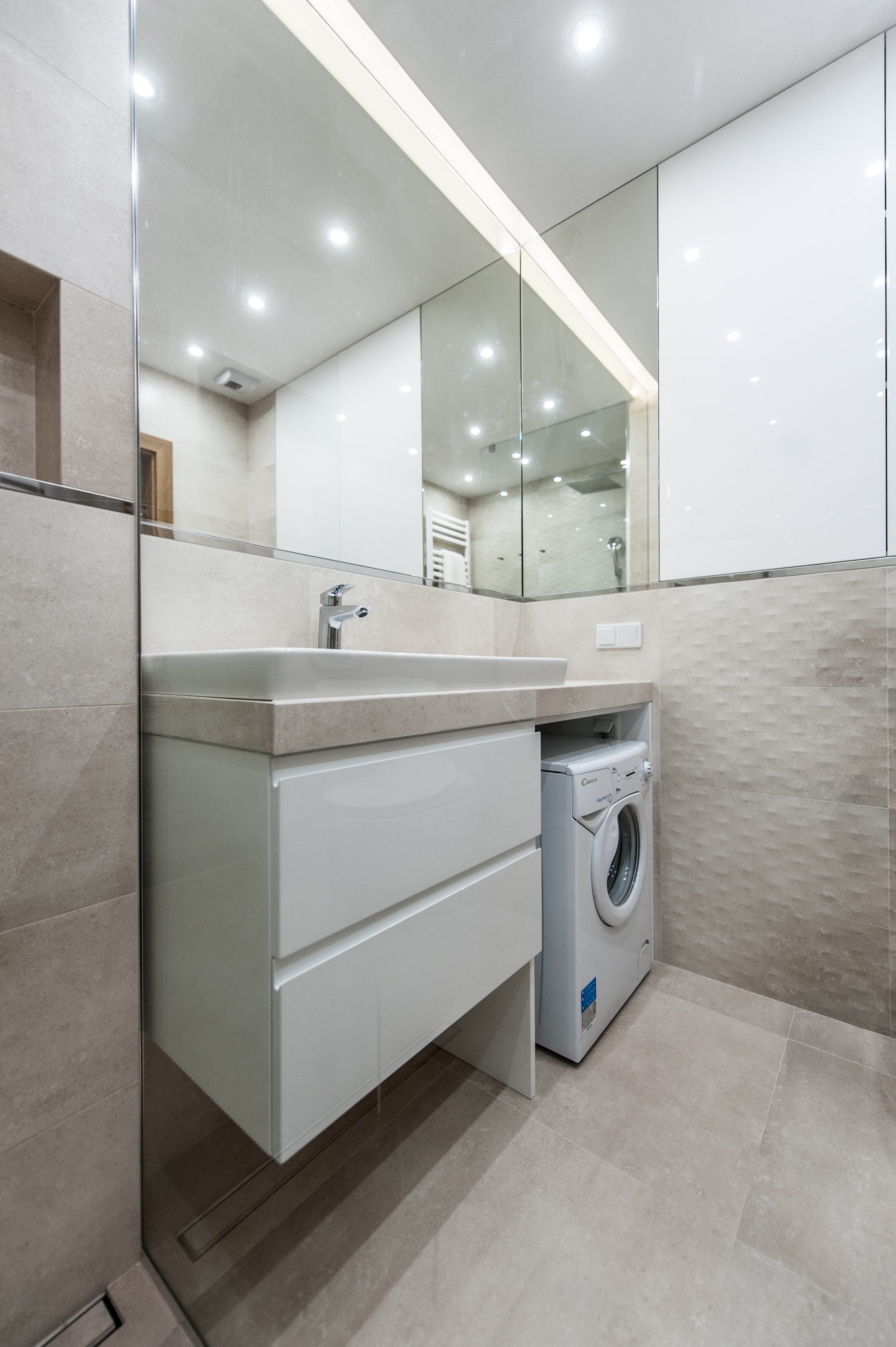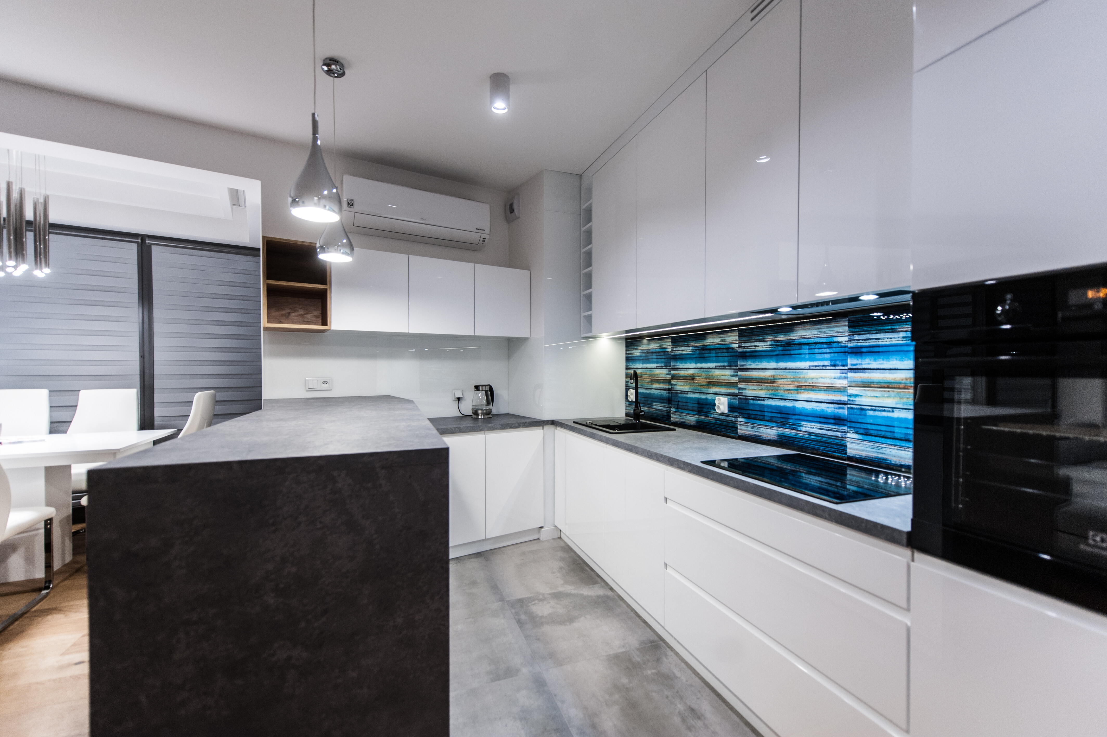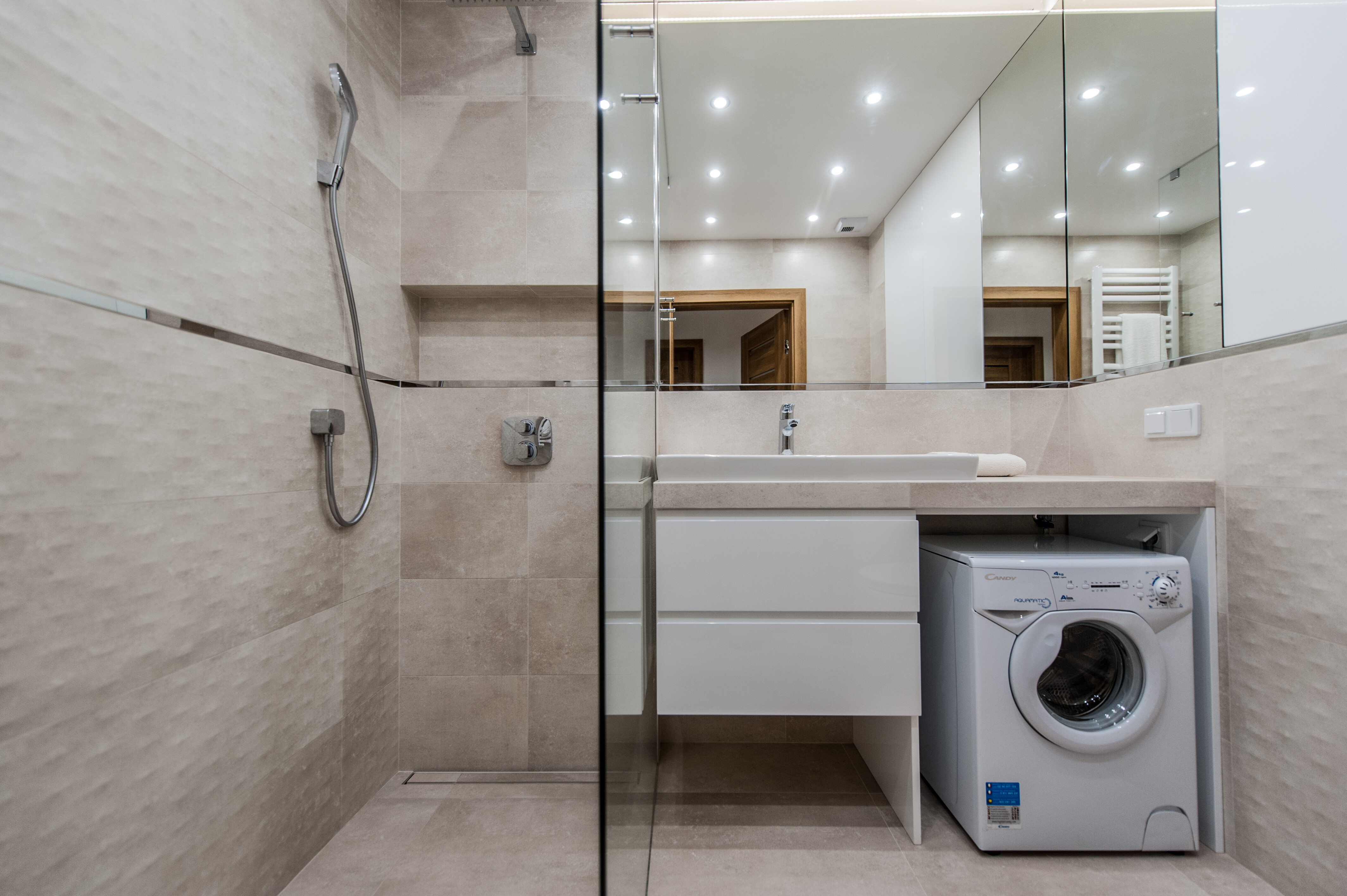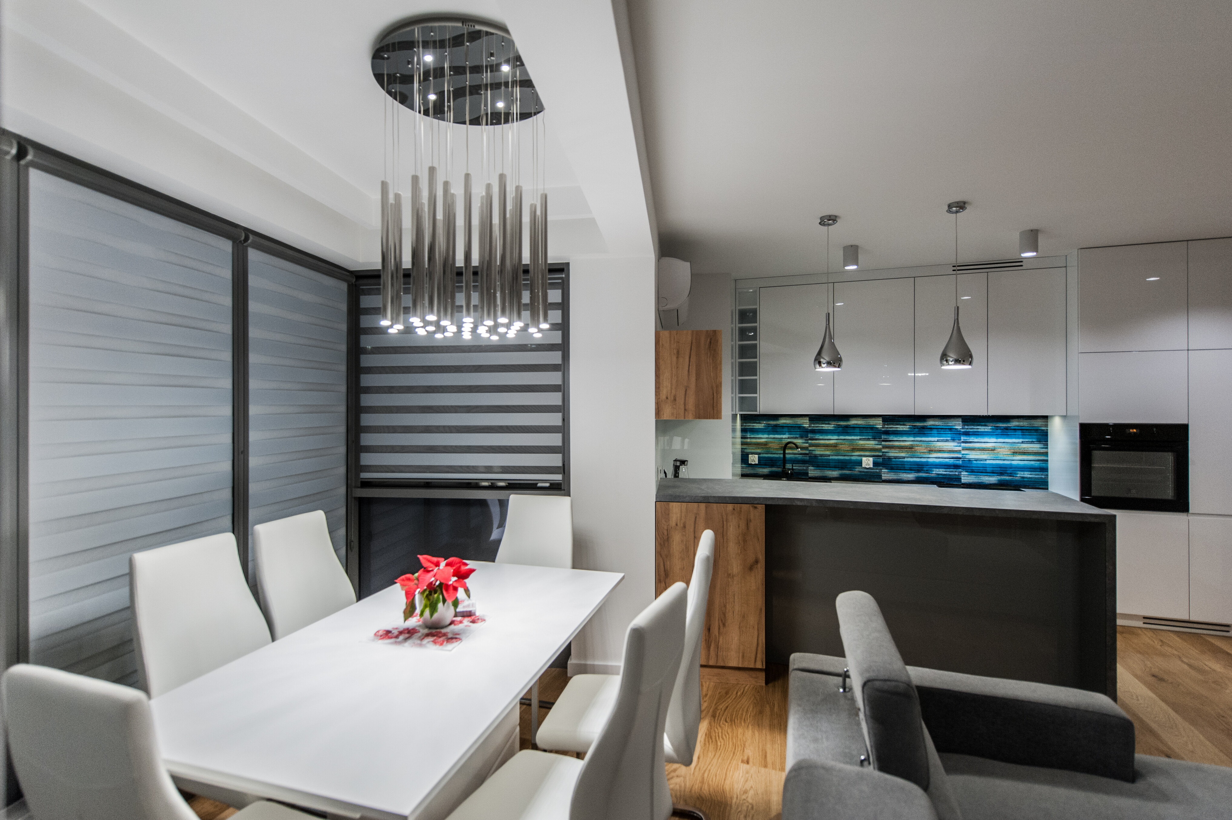 Mieszkanie z dwoma sypialniami w Krakowie, to przykład idealnej harmonii między stylem a funkcjonalnością. Zostało ono zaprojektowane tak, aby zapewnić maksymalny komfort i wygodę, z uwzględnieniem potrzeb zarówno codziennego życia, jak i estetycznych preferencji mieszkańców. Kuchnia w apartamencie prezentuje minimalistyczne piękno z białymi, połyskującymi szafkami i kontrastującymi z nimi szarymi elementami. Stylowe, wiszące lampy nad wyspą kuchenną dodają nowoczesnego charakteru, a starannie dobrane sprzęty AGD wkomponowane są w przestrzeń w taki sposób, aby maksymalizować użyteczność. Stół jadalniany jest otoczony białymi, eleganckimi krzesłami i oświetlony przez efektowny żyrandol, co tworzy idealne miejsce do wspólnych posiłków. Łazienka, utrzymana w neutralnych tonach, jest przykładem funkcjonalności, łącząc praktyczne rozwiązania z nowoczesnym designem.