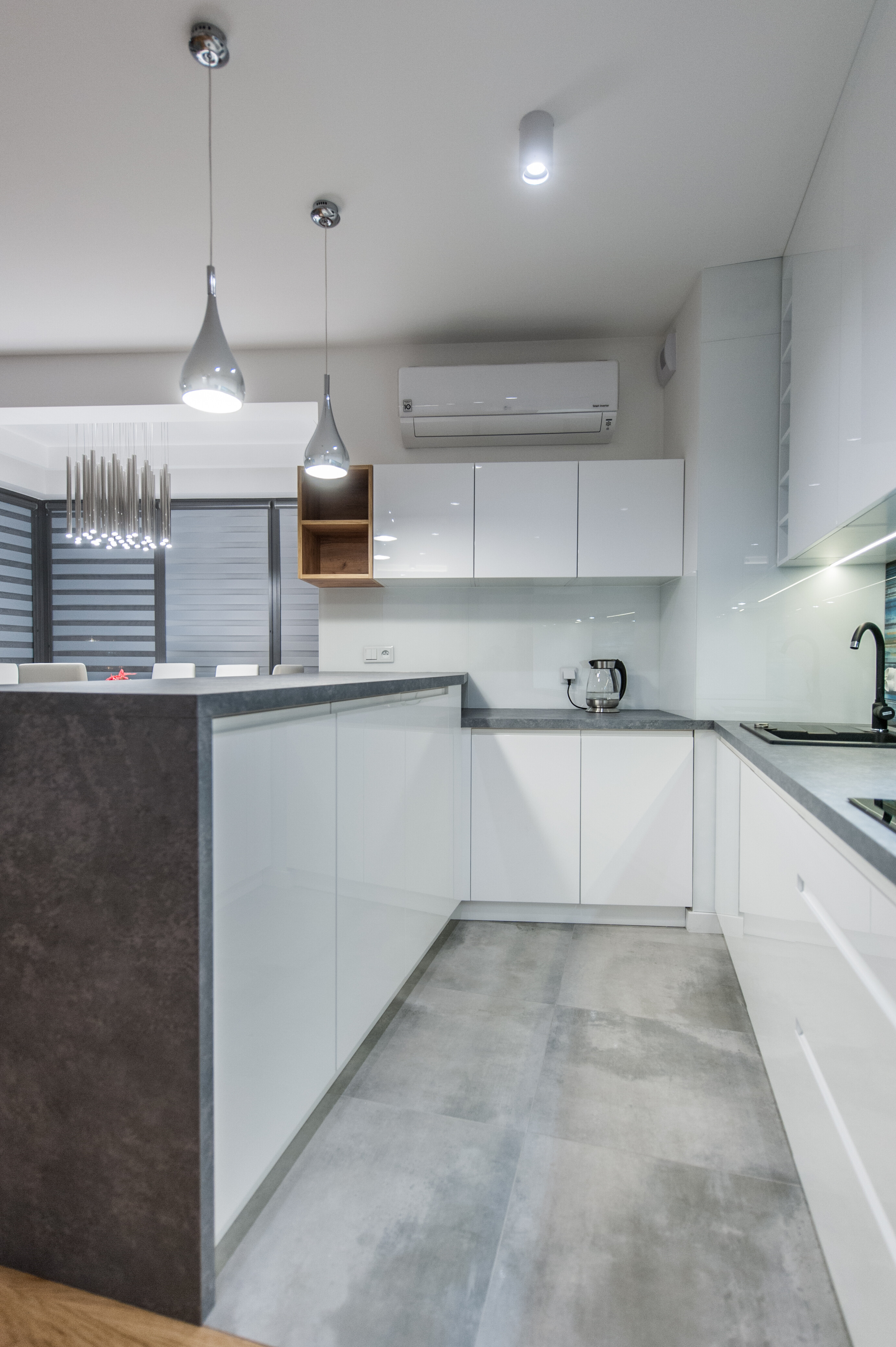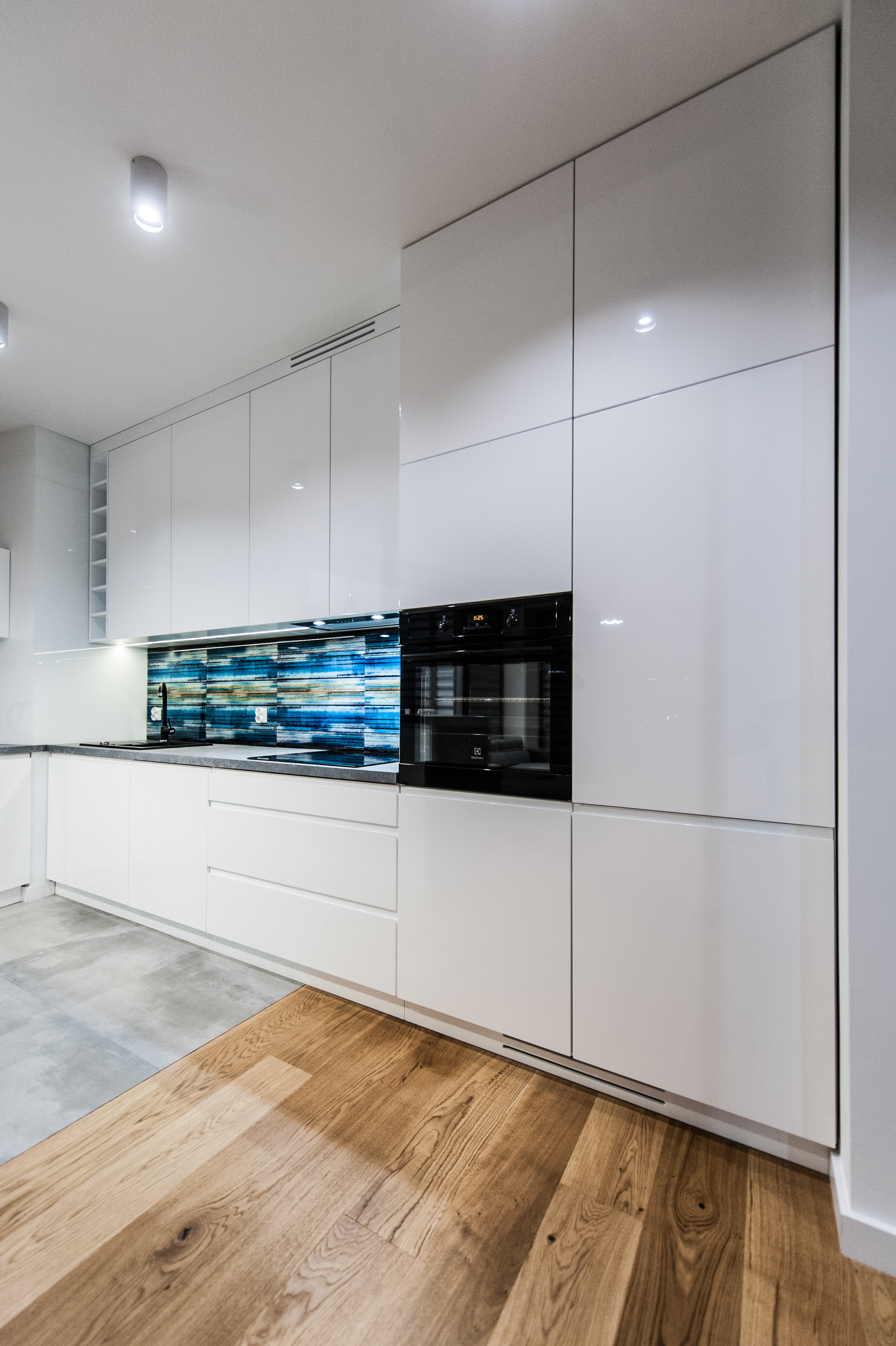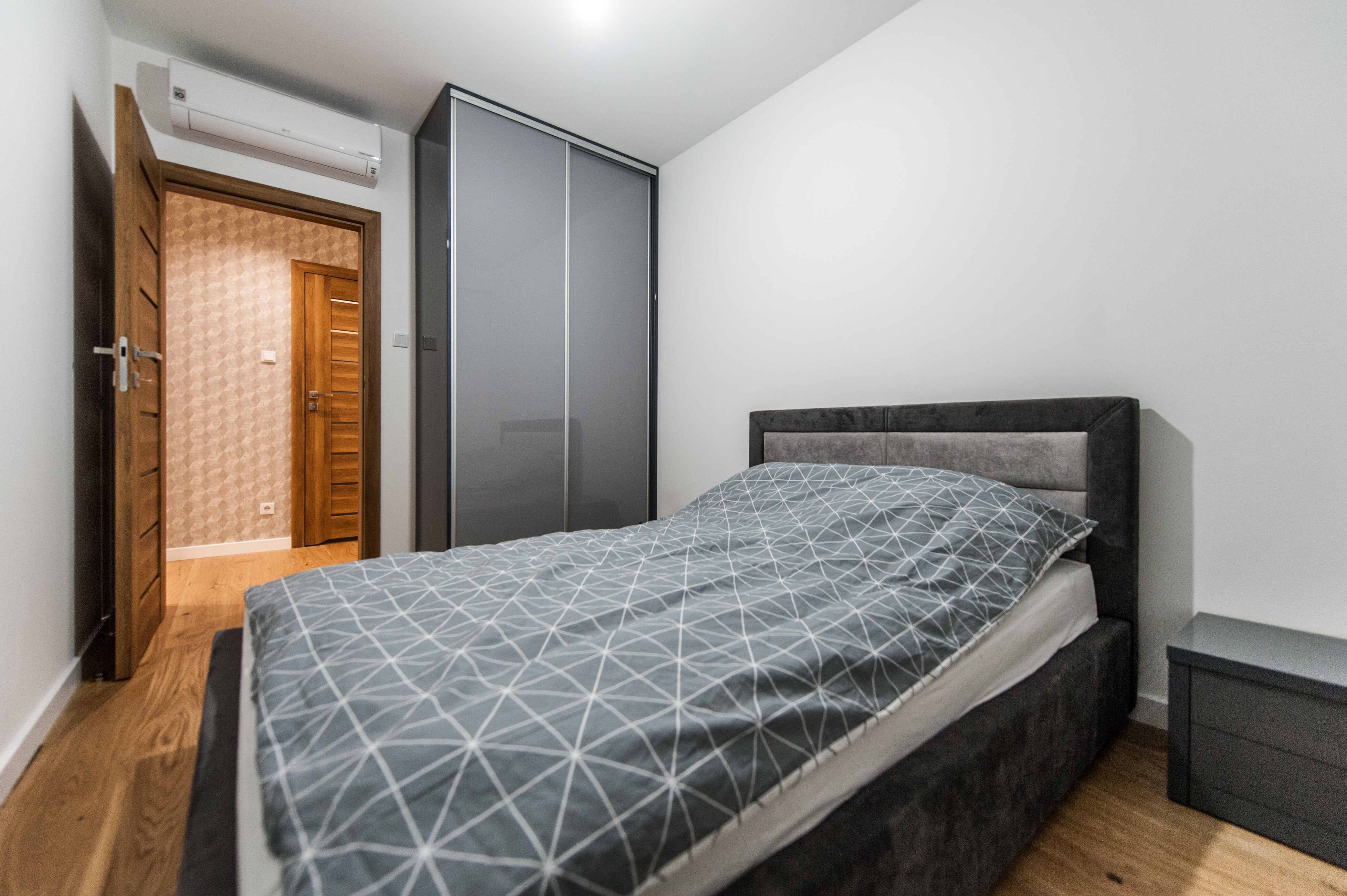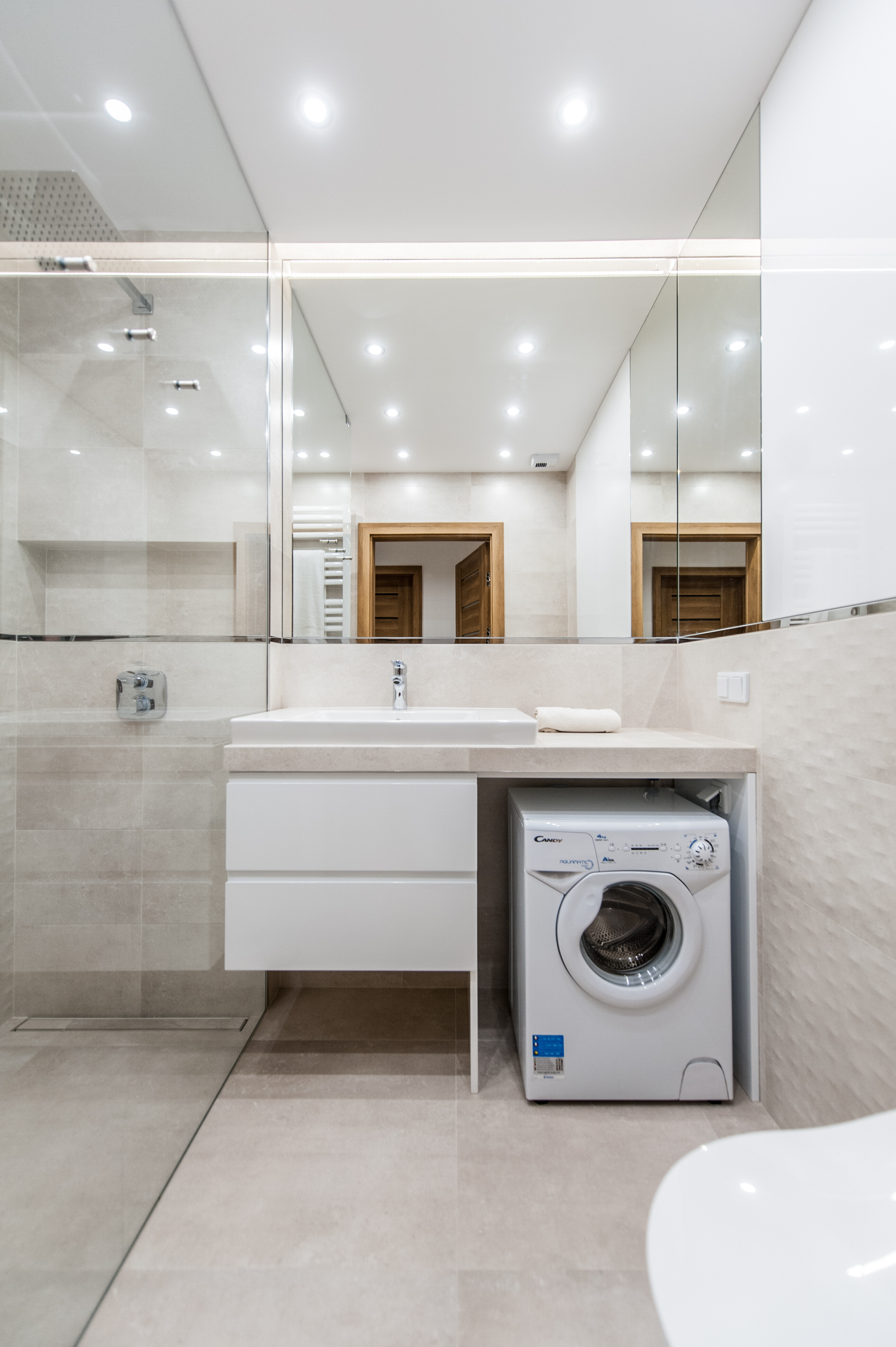 Mieszkanie z dwoma sypialniami w Krakowie, to przykład idealnej harmonii między stylem a funkcjonalnością. Zostało ono zaprojektowane tak, aby zapewnić maksymalny komfort i wygodę, z uwzględnieniem potrzeb zarówno codziennego życia, jak i estetycznych preferencji mieszkańców. Kuchnia w apartamencie prezentuje minimalistyczne piękno z białymi, połyskującymi szafkami i kontrastującymi z nimi szarymi elementami. Stylowe, wiszące lampy nad wyspą kuchenną dodają nowoczesnego charakteru, a starannie dobrane sprzęty AGD wkomponowane są w przestrzeń w taki sposób, aby maksymalizować użyteczność. Stół jadalniany jest otoczony białymi, eleganckimi krzesłami i oświetlony przez efektowny żyrandol, co tworzy idealne miejsce do wspólnych posiłków. Łazienka, utrzymana w neutralnych tonach, jest przykładem funkcjonalności, łącząc praktyczne rozwiązania z nowoczesnym designem.